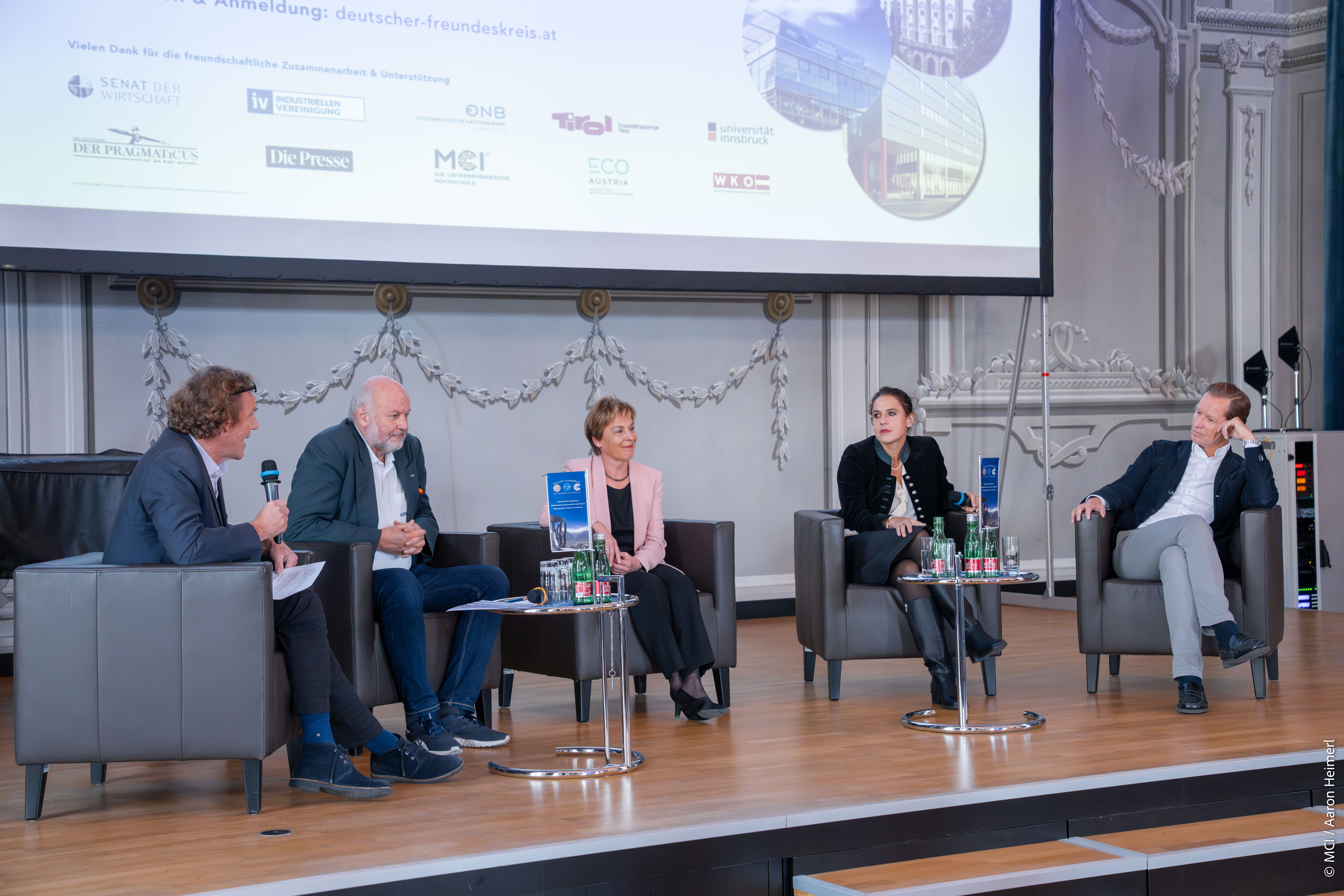 Podiumsgäste waren Theresia Theurl, Professorin für Volkswirtschaftslehre an der Universität Münster, Dieter Unterberger, Geschäftsführender Gesellschafter der Unterberger Beteiligungen in Kufstein, Monika Köppl-Turyna, Direktorin von EcoAustria in Wien und Axel Paeger, Gründer & Vorsitzender des Vorstands der AMEOS Gruppe in Zürich.